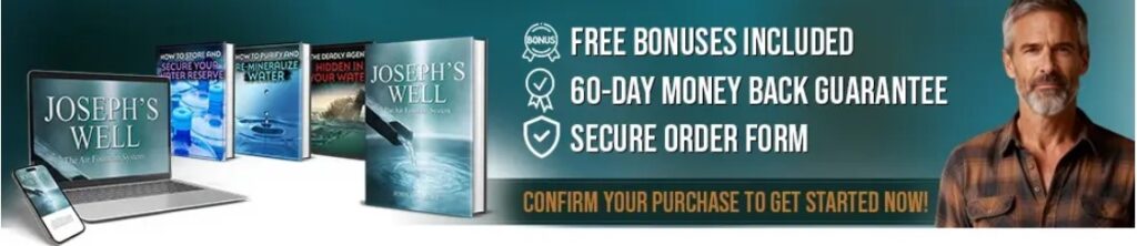 Joseph’s Well is a comprehensive water survival system delivered as a printed book (plus digital bonuses). It teaches practical, real-world techniques to secure clean drinking water without relying on expensive tools or modern infrastructure.